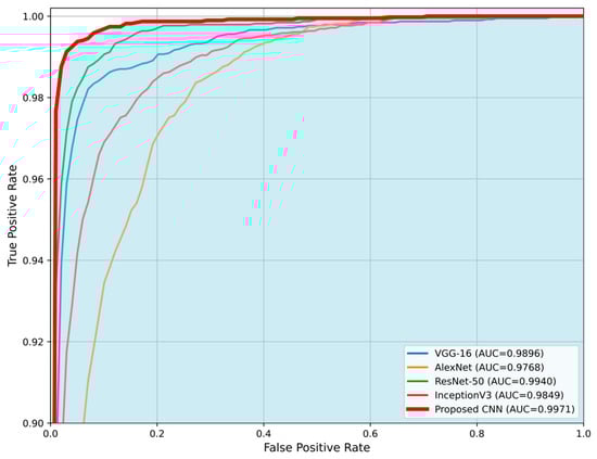 Comparison of the average Receiver Operating Characteristic (ROC) curves for the proposed CNN model and state-of-the-art architectures (VGG-16, AlexNet, ResNet-50, and InceptionV3). The proposed CNN demonstrates the highest Area Under the Curve (AUC = 0.9971), indicating superior classification performance. The blue area highlights the performance of the proposed CNN compared to the other networks.