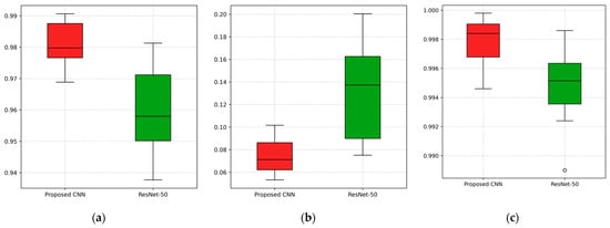 To further validate the efficacy of the proposed CNN over the ResNet-50, which achieved the second-highest performance, a statistical comparison was conducted. The Wilcoxon Signed Rank Test is a non-parametric test that is appropriate for evaluating the performance of deep learning models, where the assumption of normality is not satisfied [39,40]. The performances of the two networks were evaluated pairwise over the 12 independent runs, using the results obtained at the 14th epoch (over 15), which corresponds to the peak performance for both networks. The comparison was based on validation accuracy, validation loss and AUC value. The resulting p-value for accuracy, loss and AUC were 0.001, 0.001, and 0.005, respectively, indicating statistically significant differences (p < 0.01) in favor of the proposed model. Figure 13 presents boxplots to visualize the comparison between the proposed CNN and ResNet-50 in terms of validation accuracy, validation loss, and AUC.