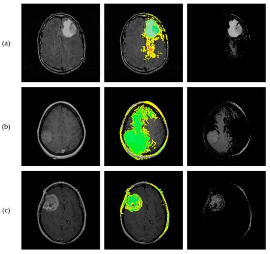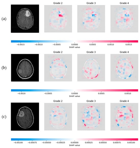 SHAP visualization illustrating the influence of slice pixels through the proposed network, providing transparency on astrocytoma grading. (a) Visualization of a Grade 2 astrocytoma sample; (b) Grade 3 astrocytoma; (c) Grade 4 astrocytoma. For each case, SHAP values are presented for all three possible class predictions. Red regions indicate positive contributions toward the predicted class, while blue regions indicate negative contributions associated with features of other grades. Color intensity reflects the magnitude of each pixel’s influence.