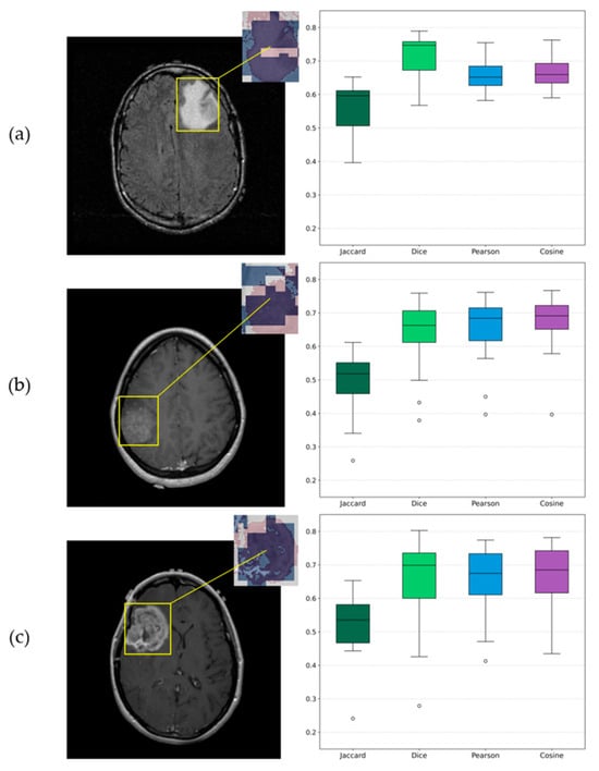 Beside the visualizations that provide a qualitative perspective for assessing each algorithm’s results, a quantitative analysis was conducted to examine their agreement across the 12 independent runs. The outcomes of this evaluation are summarized in Table 7, which presents the average similarity metrics along with the corresponding sample-based standard deviations between SHAP and LIME within the tumor regions. Additionally, a representative visualization of the mean overlay for the three examples is presented in Figure 16. From left to right, each row shows the original slice with the corresponding ROI, a zoomed-in view of the same ROI with SHAP and LIME mean maps overlaid in the red and blue channels, respectively, and boxplots derived from the similarity metrics, providing a visual representation of their distribution across experiments.