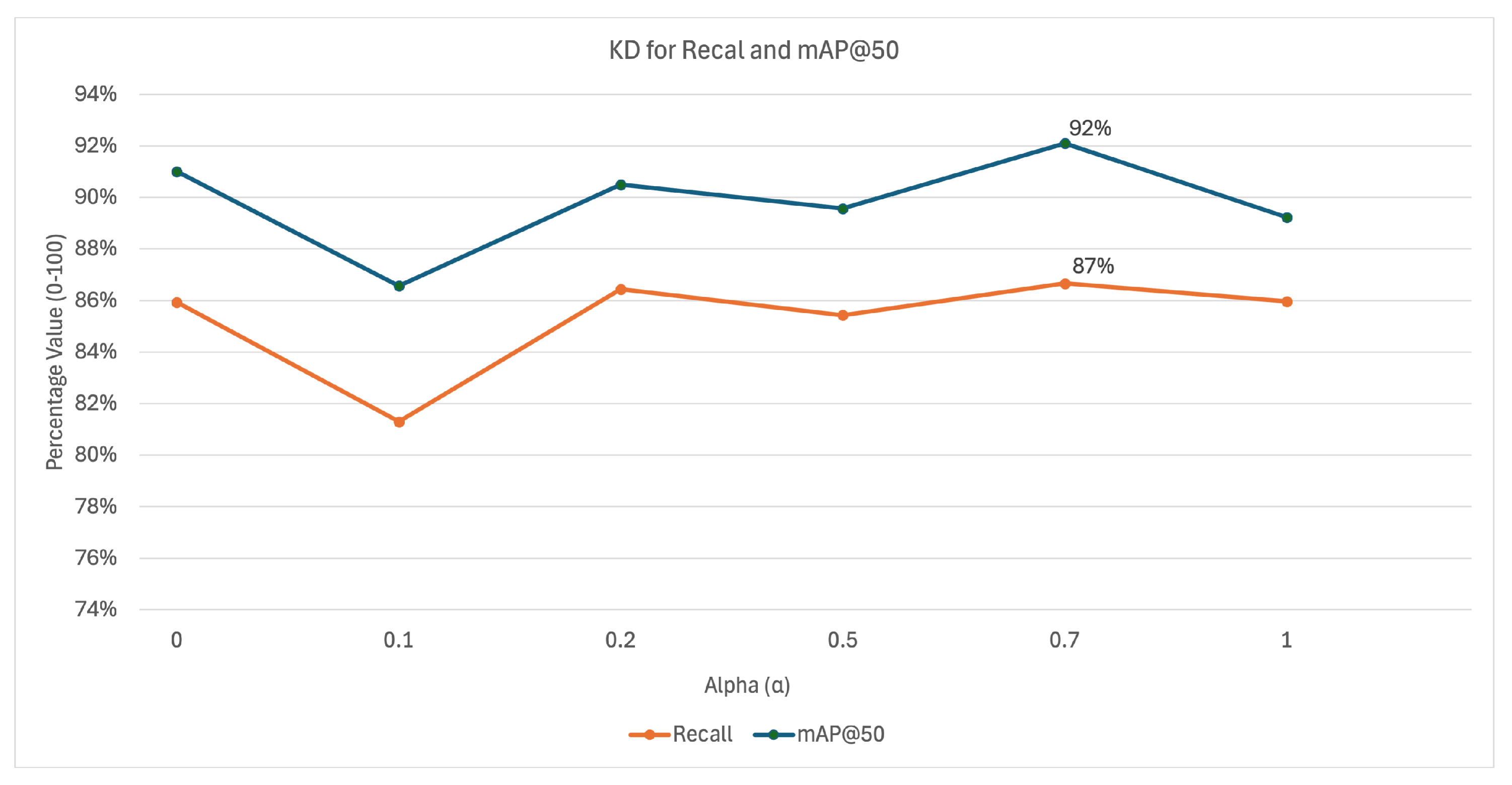 - Experiment 2: BDDCE—First, 3 ClassesThis experiment also simulates low-resource conditions using BDDCE but limits training to only 50 images from the first three classes, with the teacher model trained solely on these classes.