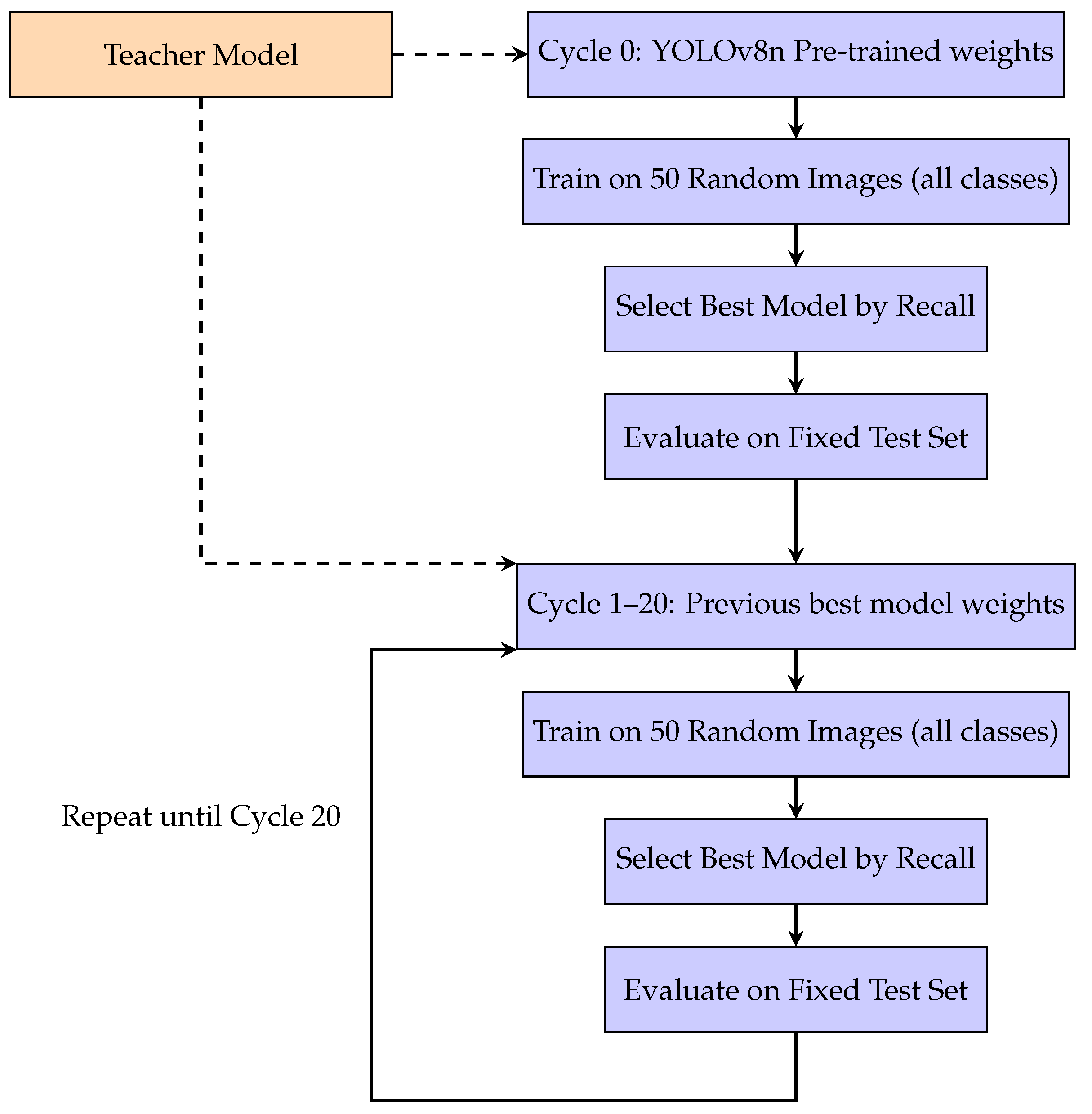 Cycle | Time (min) | Student Loss | Teacher Loss | Class Loss | Box Loss | Precision | Recall | mAP@50 | mAP@50-95 | Inference (ms) |