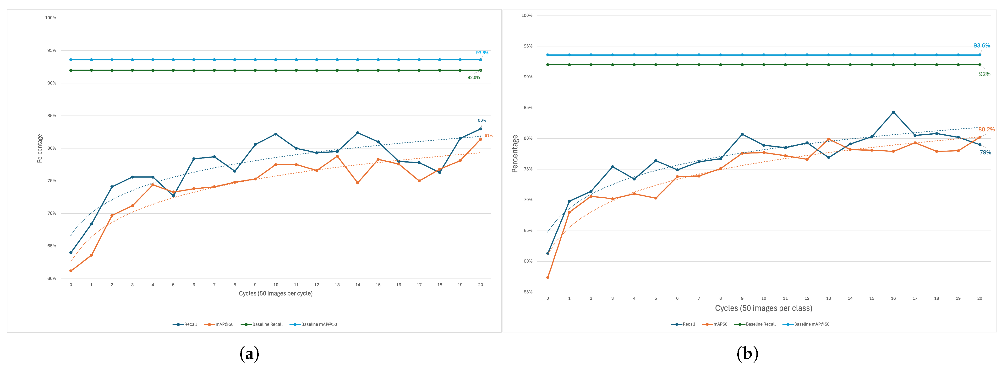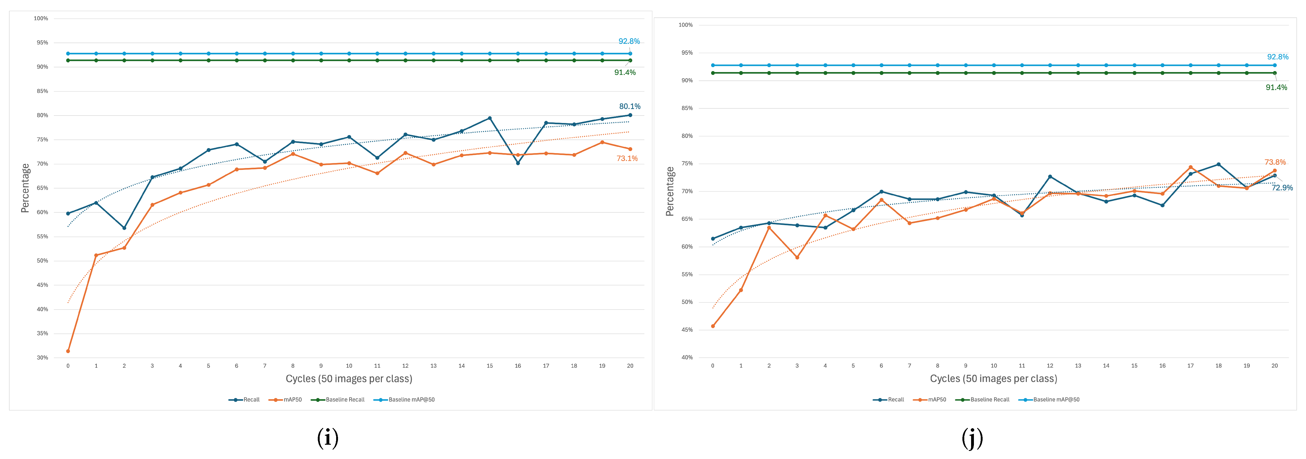 - Experiment 1: BDDCE—All ClassesThe first experiment simulates low-resource industrial conditions by introducing only 50 images per class on BDDCE.