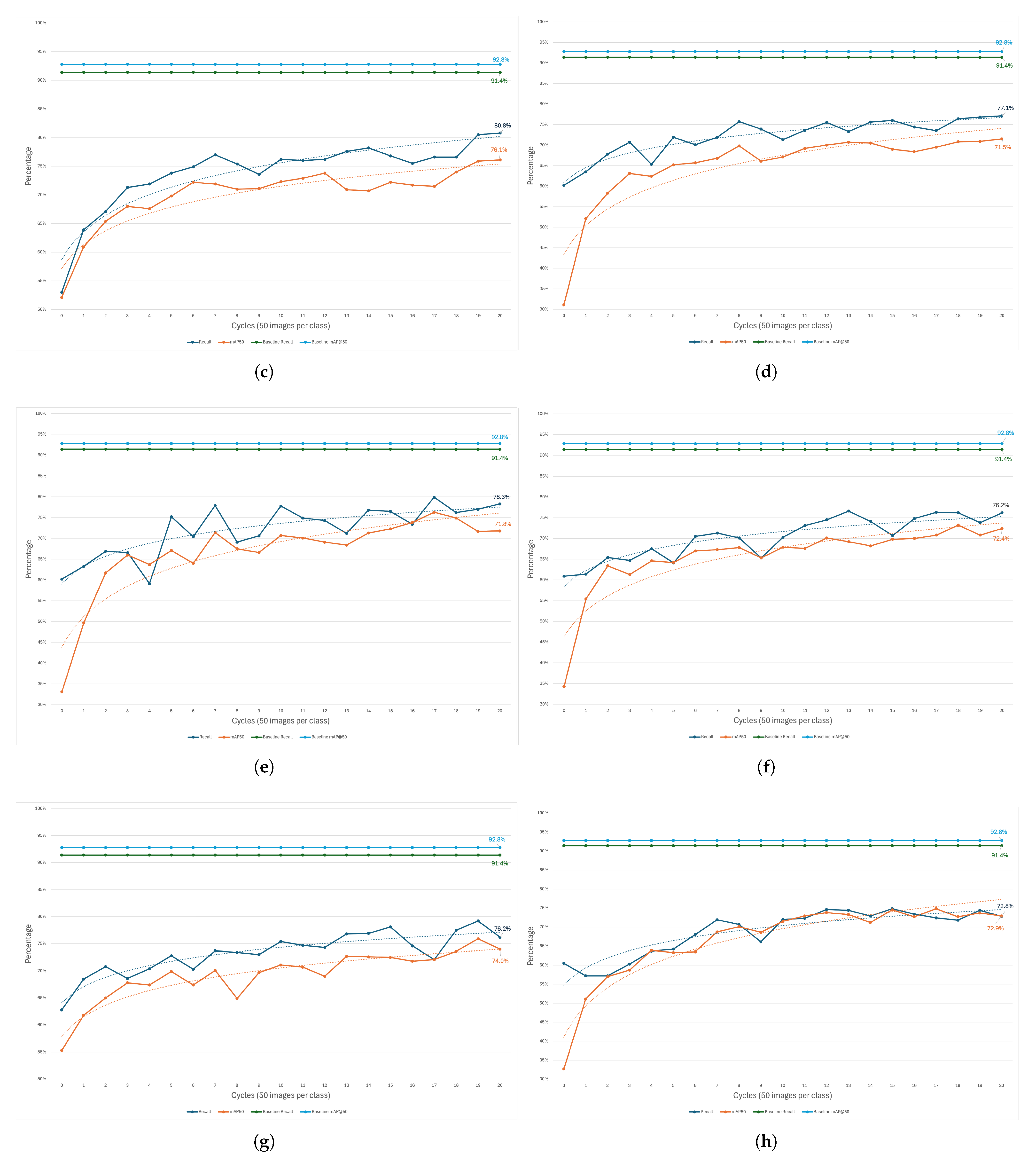 - Experiment 8: BDDCE—First, 3 Classes Baseline—Using the teacher model from the incremental learning validation experiment, this experiment simulates a scenario where only three known classes were trained in a controlled setting on BDDCE and evaluated on BDDIE.