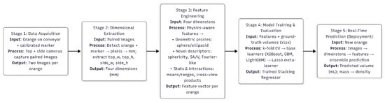 Our proposed system for non-destructive orange volume estimation is a multi-stage, data-driven pipeline, as illustrated in Figure 1. The method is designed for rapid, real-time deployment in a manufacturing environment and combines computer vision, physics-aware feature engineering, and a robust stacked machine learning ensemble. The pipeline starts with a data acquisition step in which a camera system records each orange’s top and side views. Consistent physical dimensions can be extracted from the images using a calibrated marker. A feature engineering module then processes these raw dimensions to produce a rich collection of descriptors. A strong machine learning ensemble utilises these characteristics in the last step to precisely forecast the orange’s volume.