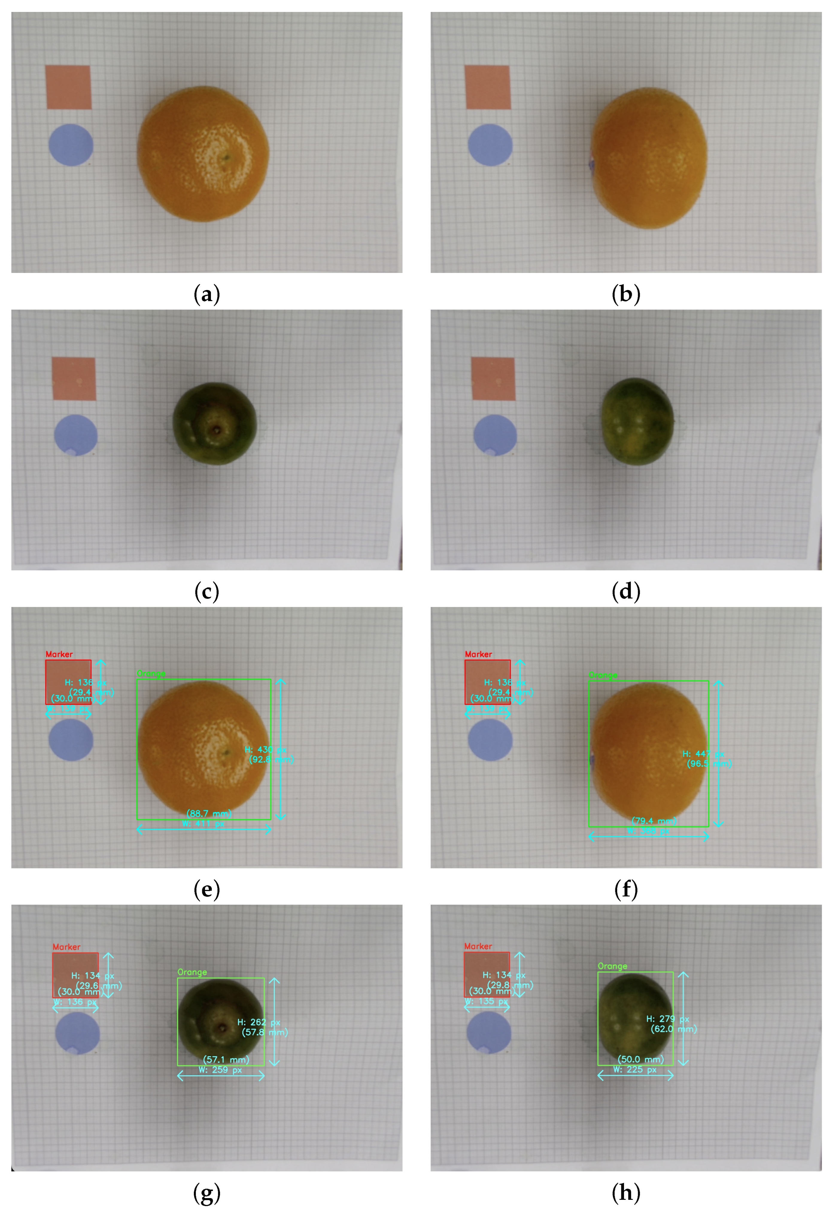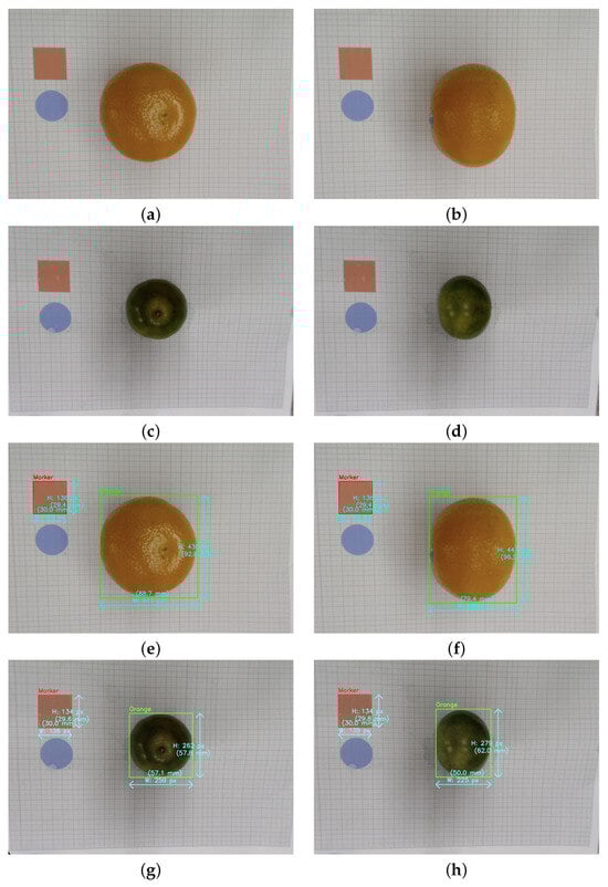 Data collection and dimensional extraction from a sample orange’s paired top and side photos: (a–d) raw view images, (e–h) images with marker and detected dimensions.