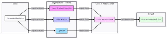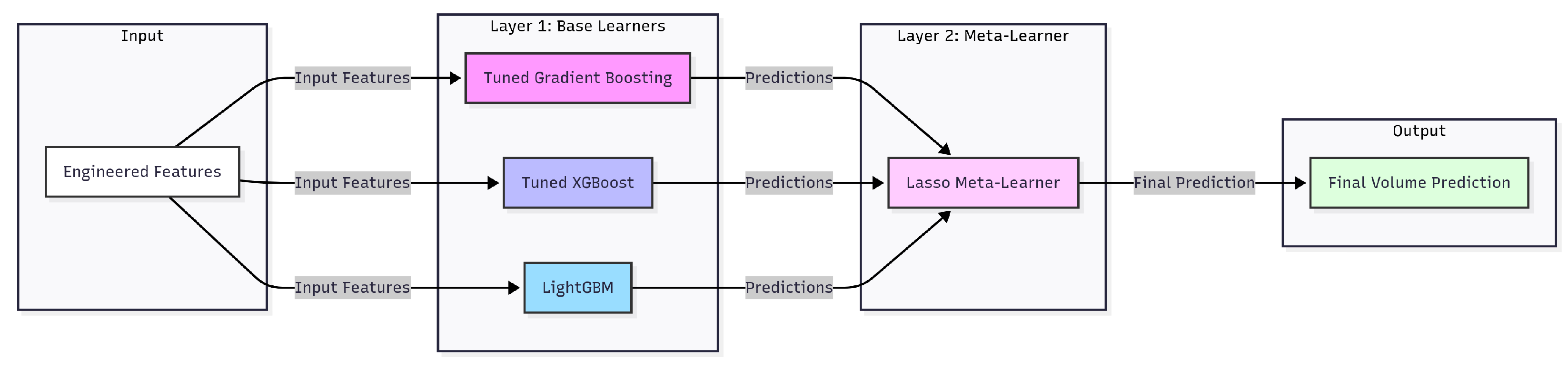 The Stacking Regressor’s two-layer architecture demonstrates how a Lasso meta-learner receives predictions from the base learners (Gradient Boosting, XGBoost, and LightGBM) to generate an enhanced final prediction.