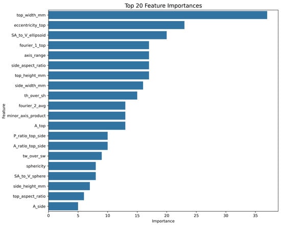 To visually verify and supplement our model’s performance metrics, Figure 4 shows a scatter plot of the actual versus predicted volumes from the Stacking Regressor. In this plot, the blue dots represent the individual predictions (data points) derived from the 5-fold cross-validation. The red dashed line represents the ideal relationship of , where predicted volume exactly equals the actual volume. The close correspondence between the data points and the line visually validates the model’s high accuracy. The residuals, or prediction errors, are shown in Figure 5. By verifying that the errors are centred around zero with no obvious skew, this box plot confirms that the model does not exhibit systematic bias across the range of predictions. Finally, the feature importance plot for our top single model, XGBoost, is shown in Figure 6. This plot demonstrates that our engineered features, particularly the shape descriptors and geometric proxies, are among the most significant predictors, thereby validating their design.