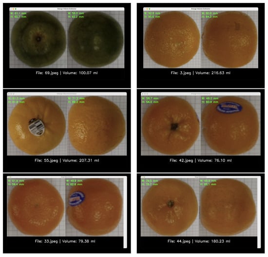We strive for conveyor-based imaging with a single calibrated scale marker in view, fixed camera geometry, and stable illumination. The method requires top and side snapshots of each fruit, as well as ground-truth volumes for supervised calibration, which can be performed once or frequently. Even though oranges are the primary focus of this study, other produce can be used with minimal modification if similar views and dimensional markers are available [].