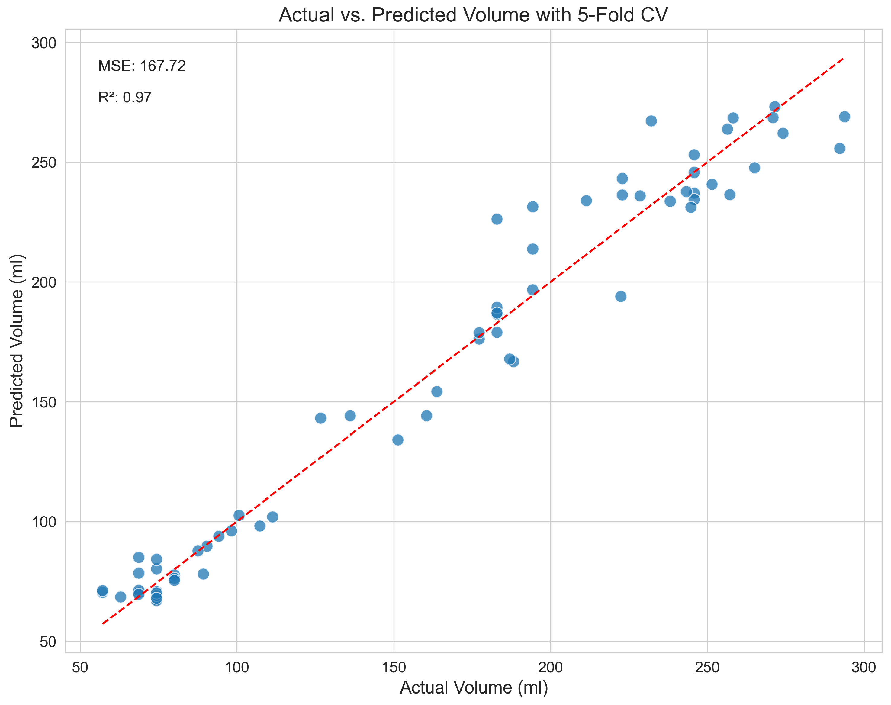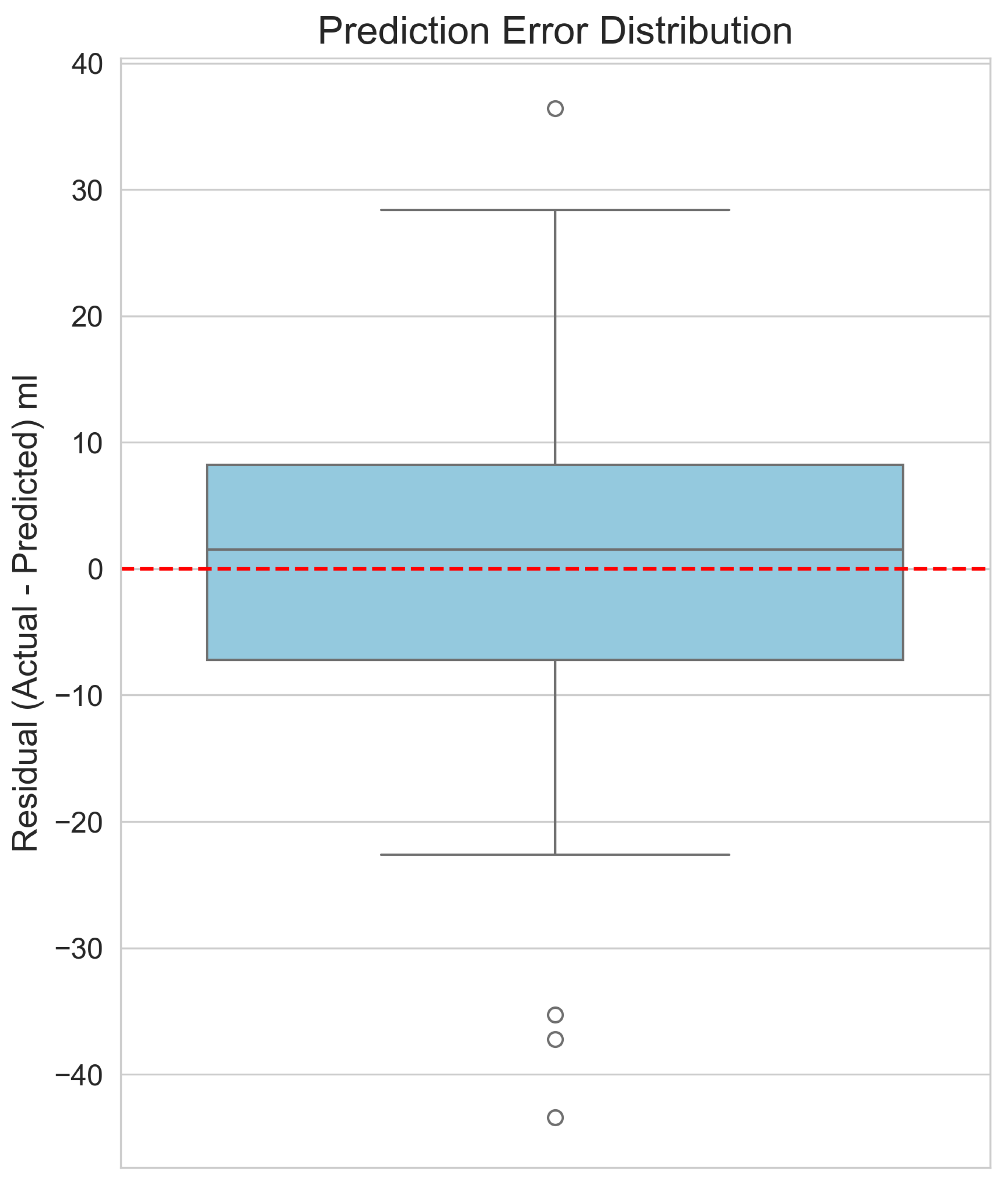 - Mean Absolute Error (MAE): This gives an intuitive understanding of the typical prediction error in millilitres by representing the average magnitude of the errors.