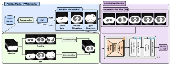 Let denote the dataset used for PF-ILD identification, consisting of N cases. Each case is represented as , where M denotes the number of CT slices. We employ a classification model , together with a PSM module to extract PMs. RSs are then selected based on the detected PMs and subsequently fed into the proposed diagnostic framework.