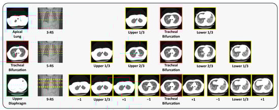 During preprocessing, DICOM files are converted into PNG format, and slices within each case are renamed sequentially from the apical lung to the diaphragm. This conversion facilitates RS extraction based on the predefined PMs. We adopt three RS extraction strategies, using three, five, or nine RSs, as shown in Figure 2. For the 3-RS strategy, the upper RS is defined as the slice located at one-third of the distance between the apical lung PM and the tracheal bifurcation PM; the middle RS is the tracheal bifurcation PM itself; and the lower RS is the slice located at one-third of the distance between the tracheal bifurcation PM and the upper diaphragm PM. For the 5-RS strategy, we select slices at one-third and two-thirds of the interval between the apical lung PM and the tracheal bifurcation PM, the tracheal bifurcation PM itself, and two-thirds and one-third of the interval between the tracheal bifurcation PM and the upper diaphragm PM. For the 9-RS strategy, we extend the 3-RS approach by including the immediate neighboring slices before and after each of the three selected RSs, resulting in nine slices in total.