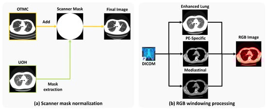 (a) Scanner mask normalization: We extract the scanner mask from UOH and use it on data from OTMC to mitigate the disparity across the two facilities. (b) RGB windowing processing: We perform three different types of organ-specific windowing and concatenate them into an RGB image. “PE” stands for pulmonary embolism.