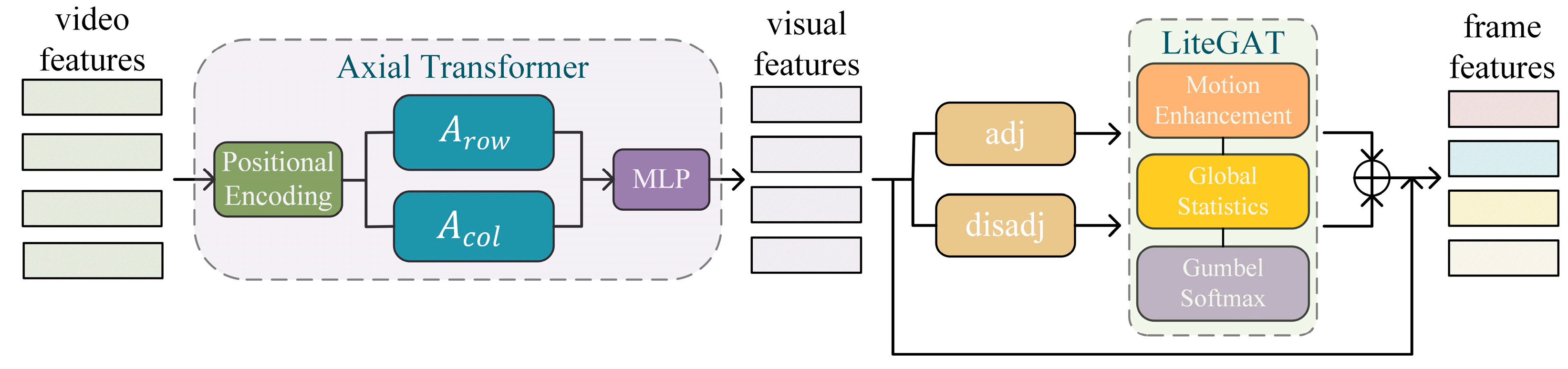 Figure 2. The architecture of AG Module. Video features are processed by the Axial Transformer to capture global temporal dependencies, then modeled with dual-branch LiteGAT using an adjacency graph (adj) and a distance graph (disadj), and finally fused to obtain enhanced frame-level representations.