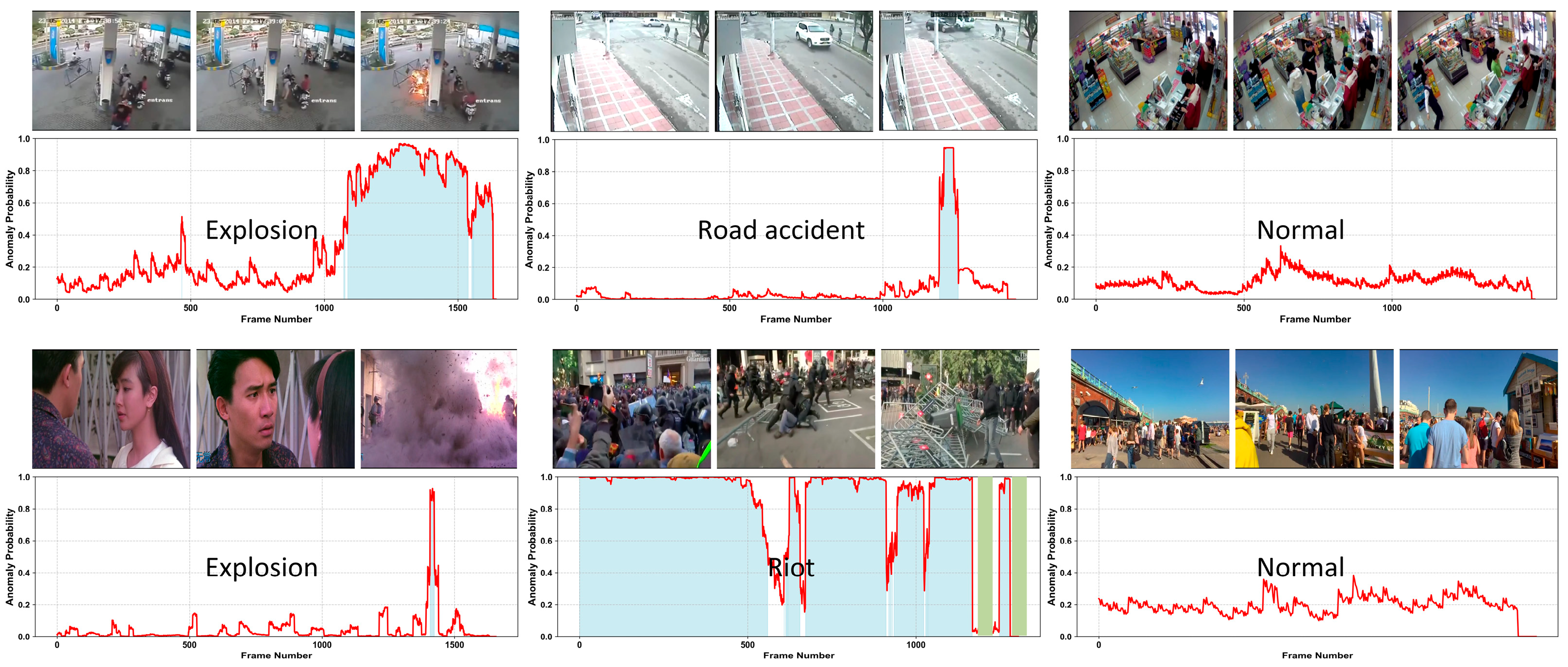 Figure 4. Qualitative results on the UCF-Crime and XD-Violence datasets. The upper row shows visualization diagrams of anomalous and normal frames from UCF-Crime, while the lower row presents the corresponding visualizations for XD-Violence. Blue-shaded regions indicate ground-truth abnormal intervals, and green-shaded regions highlight false positives and false negatives.