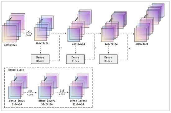 A revised network connection module, illustrated in Figure 4, was developed to enhance capsule networks. The foundational principle of this module is based on dense connections. The architecture utilizes three dense connection blocks, each comprising 32 channels, to provide the network connection layer. ReLU activation functions are employed in convolutional processing to promote feature reuse and improve the model’s overall efficiency.