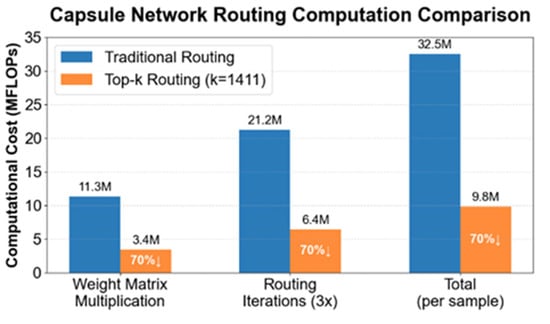 - A lightweight capsule network with low-rank matrices and down-sampling operations is presented to overcome high computational costs and hardware constraints. This effectively decreases capsule layer parameters by 70% and routing calculation by 33%, resulting in network computational optimization and reduced hardware needs.