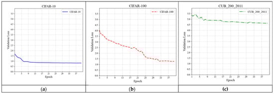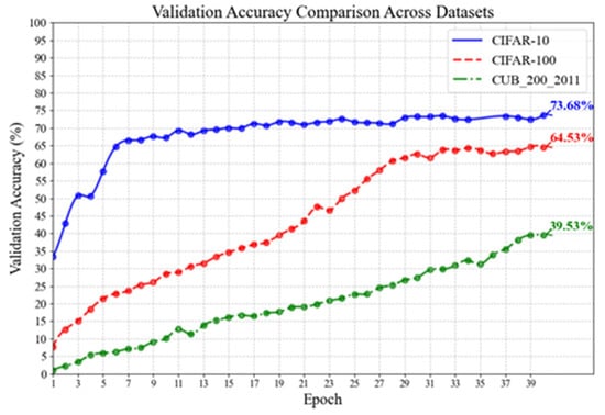 Based on existing study data from three datasets [,], The capsule network’s accuracy on the CIFAR-10 dataset ranges between 75% and 93%. Using other models as a backbone increased the accuracy to 94.97% []. On the CIFAR-100 dataset, the performance of the enhanced capsule network fluctuates significantly and is maintained within the range of 43–68%, whereas the improved DeepCaps+ based on DeepCaps reaches an accuracy of 67.56% []. For CUB, the image size of the dataset itself cannot fit the input requirements of the capsule network well; there are relatively few related studies, and there is a lack of strong data comparison for the time being. Therefore, the focus of this paper will be on the optimization comparison with the classical capsule network. Based on the above data, the improved capsule network presented in this paper achieves higher classification accuracy across three datasets compared to other current research methods.
