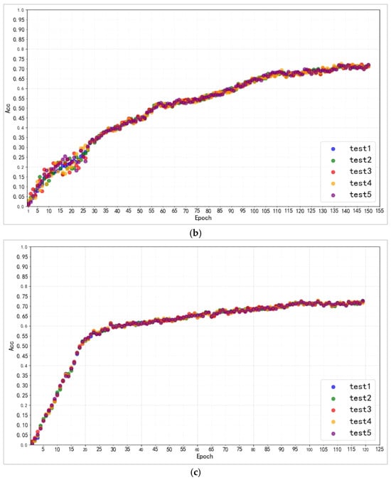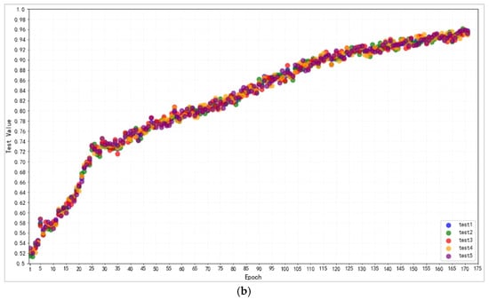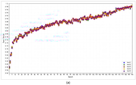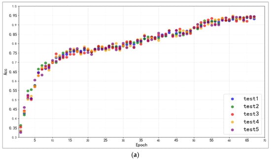 Finally, Table 8 and Figure 11 demonstrate the performance of this completely upgraded capsule network on two datasets. Table 8 shows the average of the final indicators. Figure 11a,b shows the accuracy scatter plot distributions for the two datasets over five different experiments.