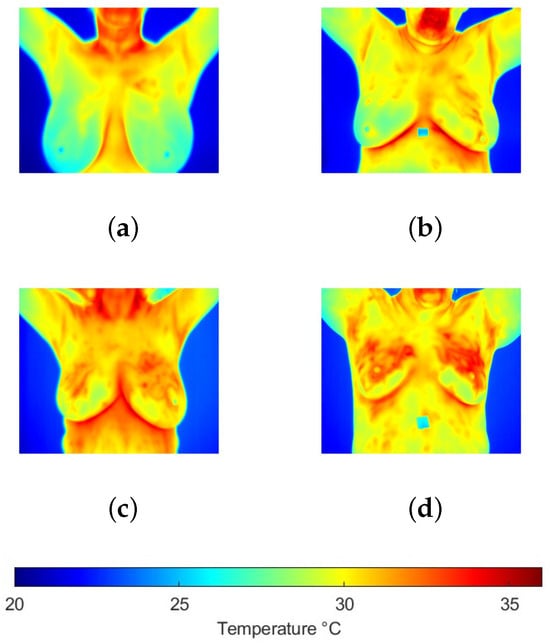 Figure 1. Breast thermograms samples from the (a,b) control and (c,d) cancer groups, where it is observed that increased temperatures are present in the second group.