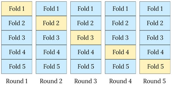 At each iteration, k − 1 folds are selected for training, and the remaining fold is used for testing. Thus, in each round, a model is trained and fitted so that the training and test folds differ each time, as illustrated in Figure 3. This strategy enables the representation of both majority and minority classes in each fold, thereby reducing variance and bias in performance metrics.