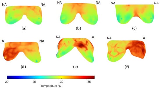 Figure 5. Examples of the breast region extraction in thermograms (ac) of the control and (df) cancer groups. Labels above each breast indicate whether no anomalies (NA) or anomalies (A) were detected using the CT classifier, matching the expert’s label.
