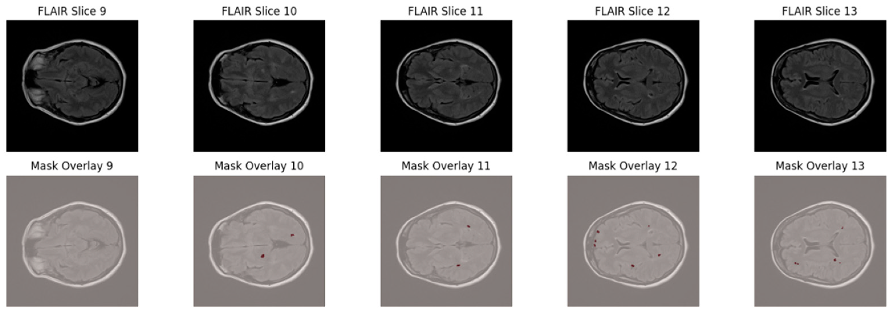 Figure 2 displays five consecutive FLAIR slices (Slices 9–13) with corresponding lesion overlays. This visualization demonstrates the sparse, scattered, and anisotropic nature of MS lesions, reinforcing the necessity for robust multi-slice learning and patch-based training strategies.