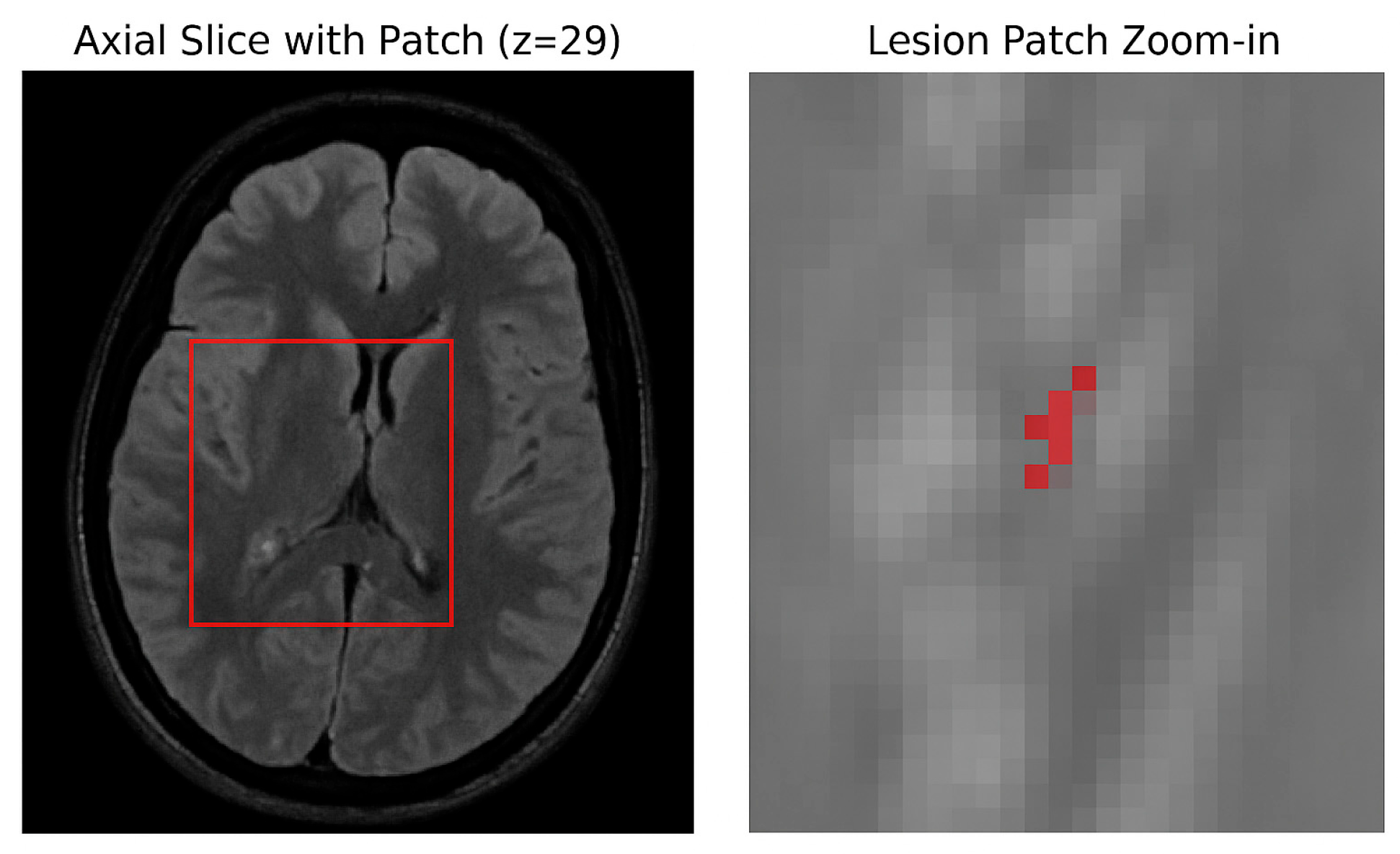 The manually segmented lesion masks were binarized using a fixed threshold of 0.5, where voxels with intensities greater than 0.5 were labeled as lesions (1), and those with intensities less than or equal to 0.5 were labeled as background (0). This binarization standardized all ground truth masks for the binary segmentation task. The dataset was split at the patient level into three mutually exclusive subsets 70% for training, 15% for validation, and 15% for testing using a fixed random seed to ensure reproducibility. To prevent data leakage, patches from the same patient were not shared across different subsets. Due to the large size of the 3D MRI volumes and the sparse occurrence of lesions (approximately 0.29% voxel ratio), a patch-based training strategy was adopted. Specifically, 3D patches of size 64 × 64 × 64 voxels were dynamically extracted during training with a balanced sampling approach: 50% of patches were centered on lesion-positive voxels, while the other 50% were randomly sampled from non-lesion areas. This approach effectively increased the representation of lesion-containing samples, addressing the severe class imbalance inherent in the data, as illustrated in