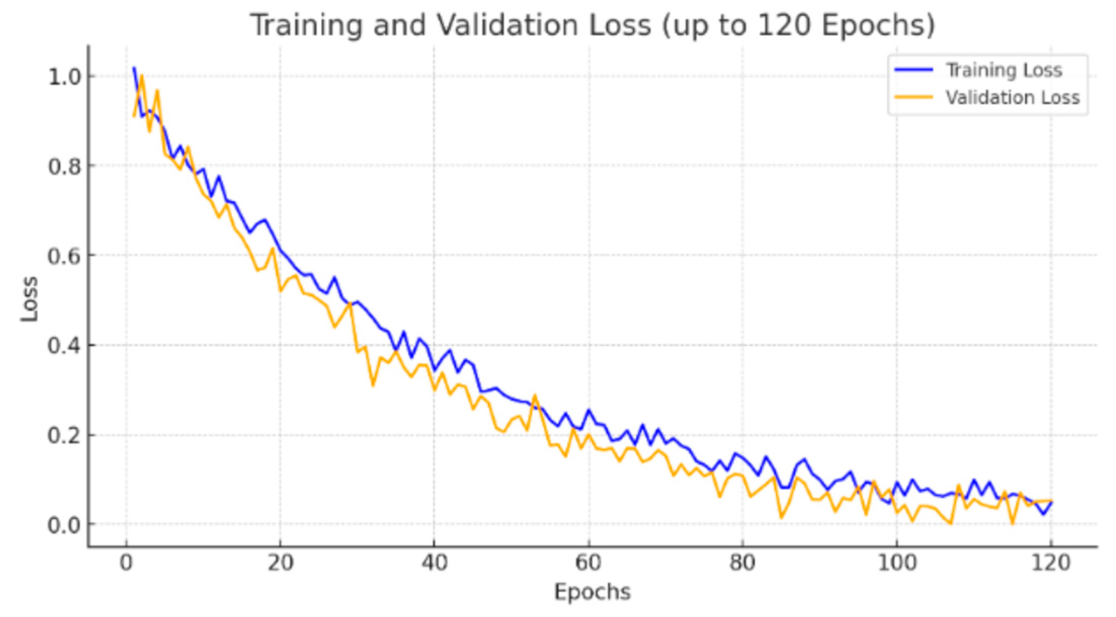 To further stabilize training and improve generalization, a Cosine Annealing Learning Rate Scheduler was integrated into the training pipeline. This scheduler decays the learning rate smoothly over epochs according to a cosine function, encouraging escape from local minima and better convergence. The scheduler was configured with a cycle length of Early stopping with a patience of 25 epochs was applied to prevent overfitting.