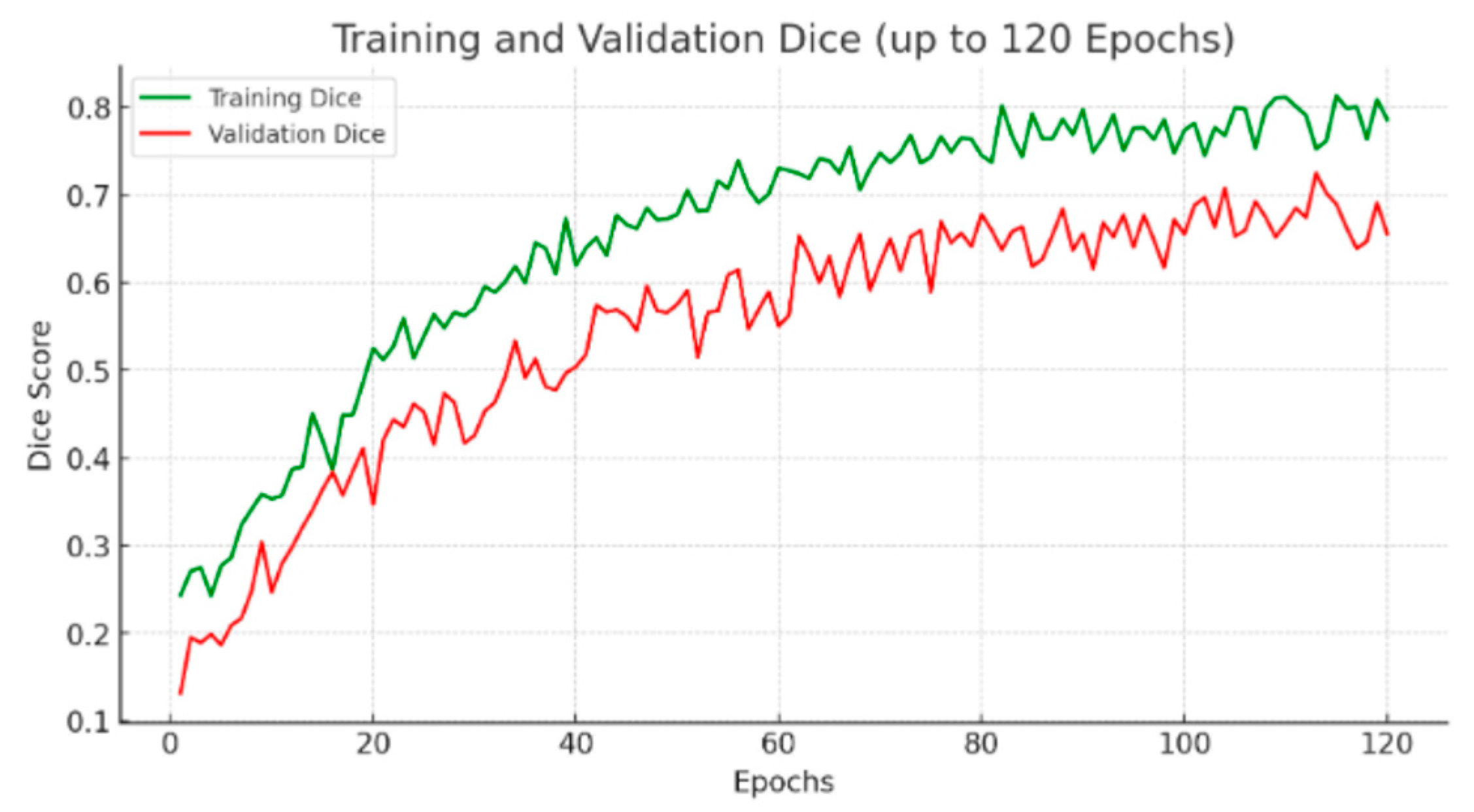 Figure 7, although both training and validation losses exhibit fluctuations due to the severe class imbalance (lesion voxels ≈ 0.29%), the validation Dice score plateaued after approximately 80 epochs, and no further improvements were observed with extended training. This confirms that the apparent instability of the loss curve is primarily a reflection of dataset sparsity rather than incomplete training, and that convergence was achieved with early stopping at the optimal checkpoint.