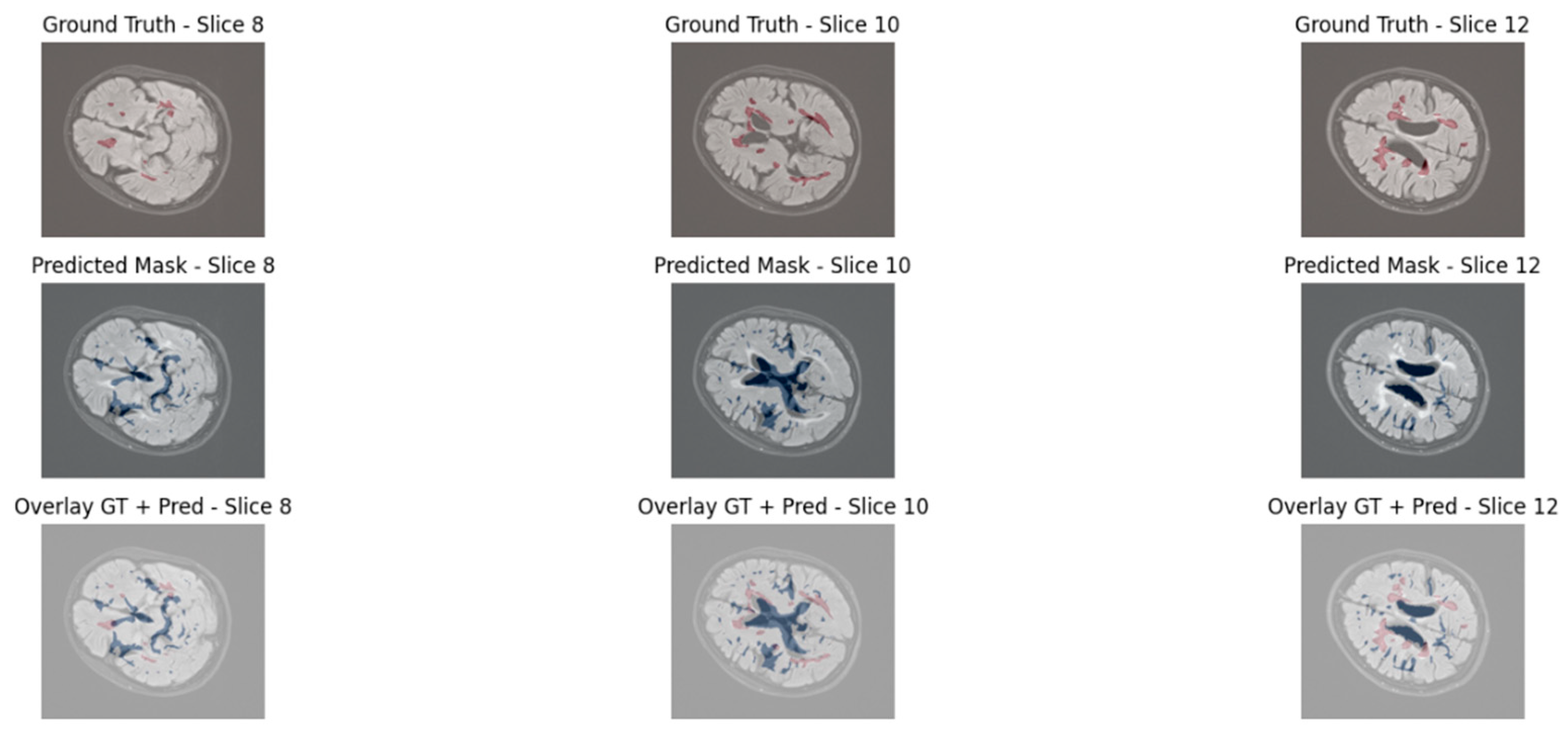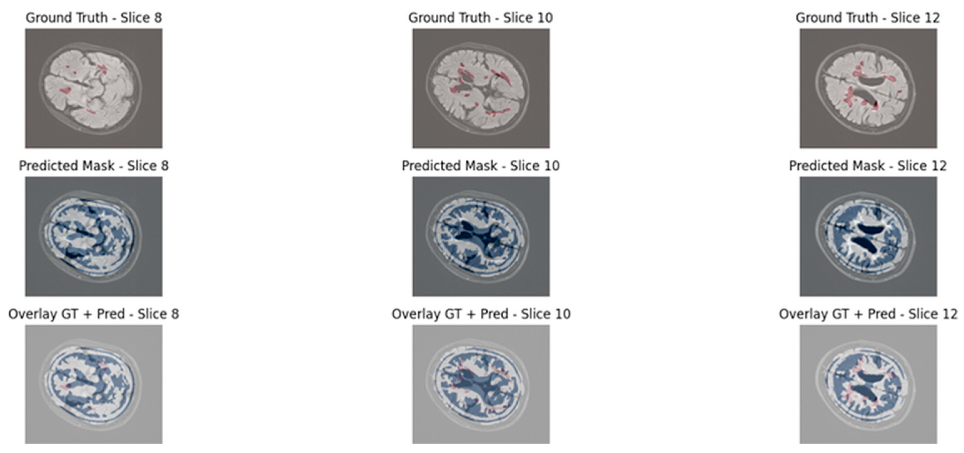 Figure 8, the overlay reveals frequent under-segmentation and poorly delineated lesion boundaries, consistent with the model’s lower Dice and precision scores observed in the quantitative analysis. Although the achieved Dice score (48.39%) is lower than some reported in 2D or more complex transformer-based models, this difference arises from methodological and design choices. Our evaluation is based on 3D volumetric segmentation with strict voxel-wise metrics, applied to a dataset characterized by sparse lesion volumes. Moreover, the proposed architecture was optimized for efficiency and deployability, with significantly fewer parameters than conventional 3D or transformer-based models. Consequently, while Dice remains challenging in this setting, complementary metrics and uncertainty analysis confirm the robustness and clinical relevance of the proposed approach.