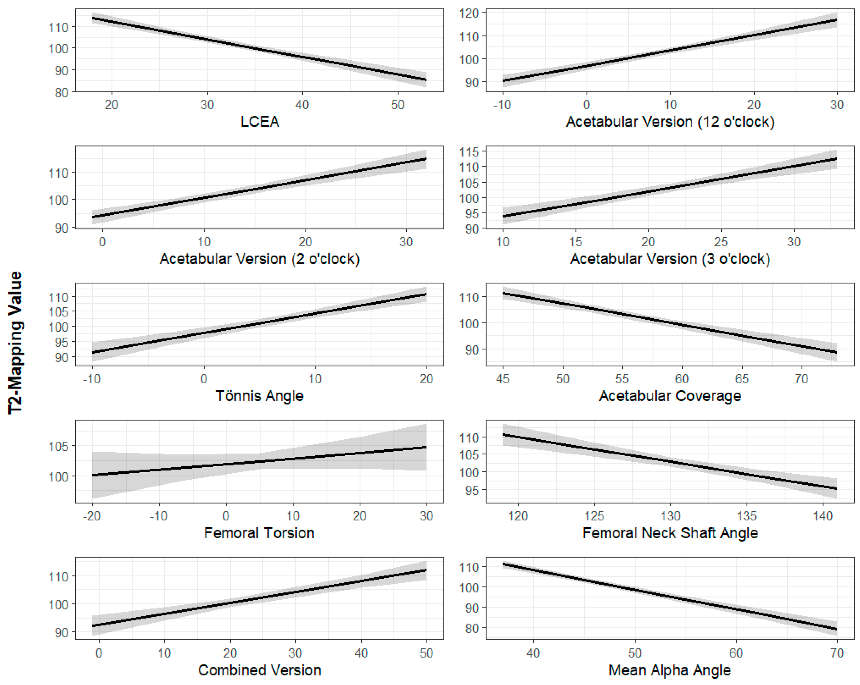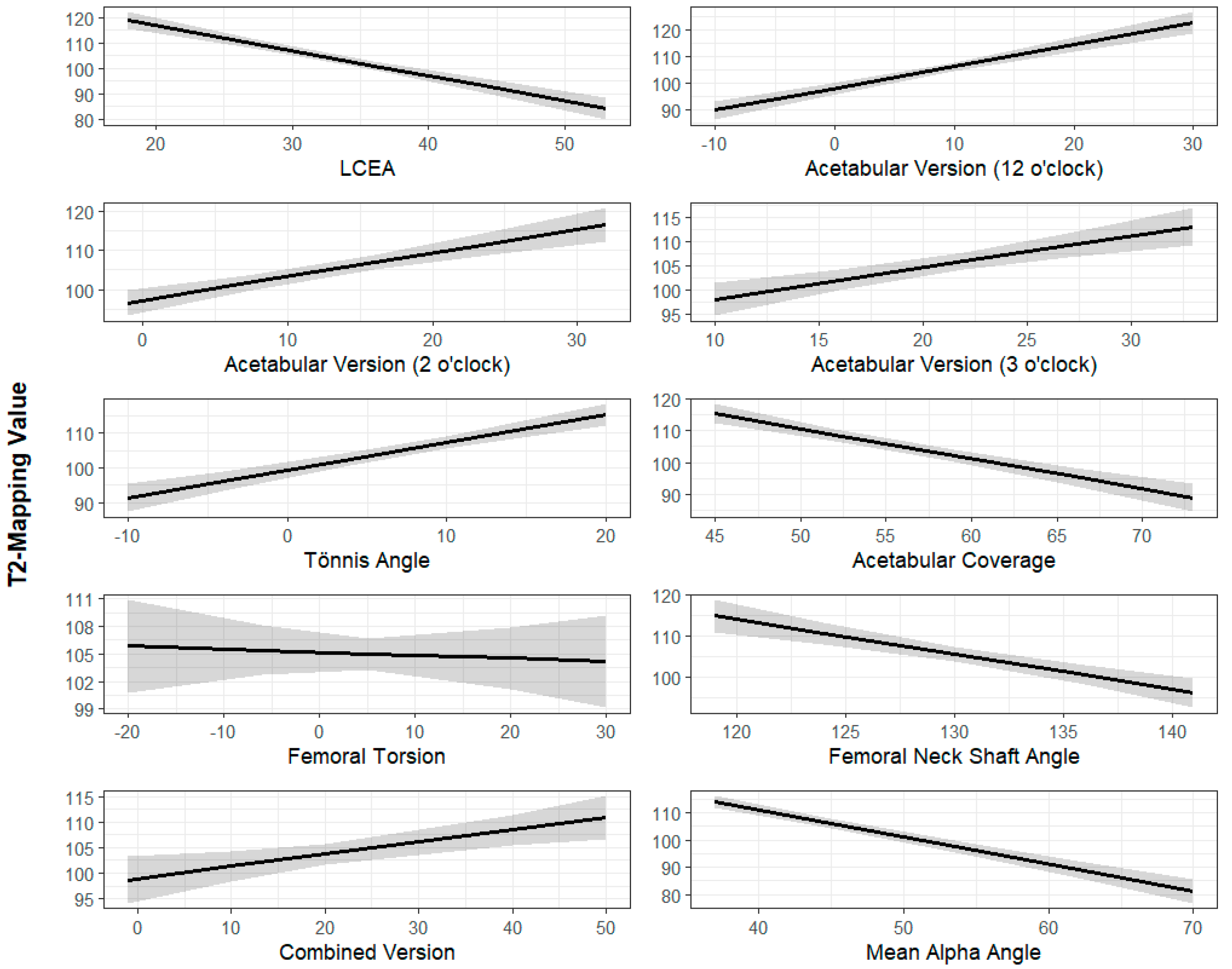 Significant associations were observed for acetabular and femoral articular cartilage and all morphology parameters except femoral torsion. These findings indicate that the patterns of articular cartilage wear are complex and dependent on multiple anatomic abnormalities. The data show that increased T2 mapping values, indicative of poorer tissue quality, were associated with a decreased LCEA, increased acetabular version at 12 o’clock, 2 o’clock, and 3 o’clock, an increased Tönnis angle, decreased acetabular coverage, and a decreased alpha angle. These values align with the described ranges of hip dysplasia [