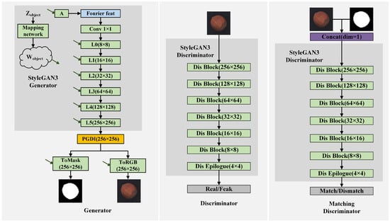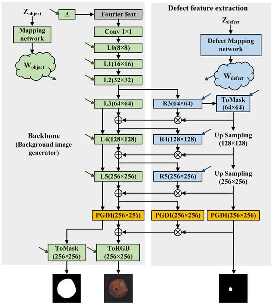 - A lightweight StyleGAN3 [17] variant jointly generates the background and a background mask, while a matching discriminator enforces coherence between the generated background and mask. The Progress-coupled Gated Detail Injection (PGDI) module regulates detail strength according to training progress, raising high-frequency fidelity while maintaining training stability. The coupling of joint mask generation with coherence supervision and progress-driven detail control yields more realistic backgrounds and enables the subsequent defect-generation stage to capture complete morphology and sharper boundaries.