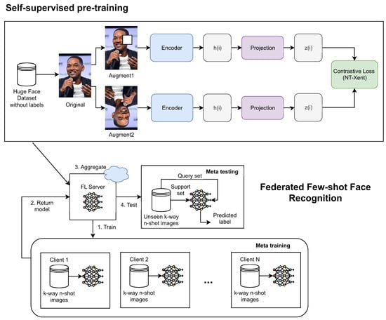 Despite the individual success of federated learning [10,11], self-supervised learning [14,15,18], and few-shot learning [19,20,21] in face recognition, their integrated potential remains largely unexplored in the literature. Previous work has primarily focused on addressing these challenges in isolation, failing to take advantage of the complementary strengths of these paradigms. For example, while Kim et al. [11] proposed federated learning for face recognition via self-supervised intrasubject learning, their approach did not incorporate few-shot learning capabilities for efficient adaptation to new identities. Similarly, existing few-shot face recognition methods [20,22] typically assume centralized training scenarios and do not address concerns about privacy preservation or communication efficiency inherent in federated environments.