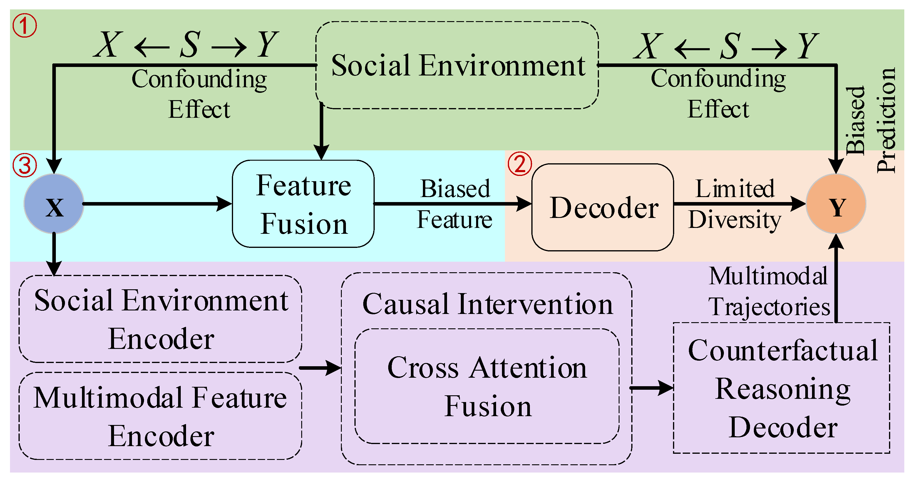 To systematically analyze and formalize the aforementioned issue, we utilize a SCM, aiming to clearly characterize the intrinsic causal mechanisms between variables. This SCM comprises three core variables (nodes): X (denoting the historical trajectory), Y (denoting the future trajectory), and S (denoting the social environment). The directed edges in the model explicitly represent the causal relationships between variables, i.e., cause → effect. We elaborate on each directed edge as follows: