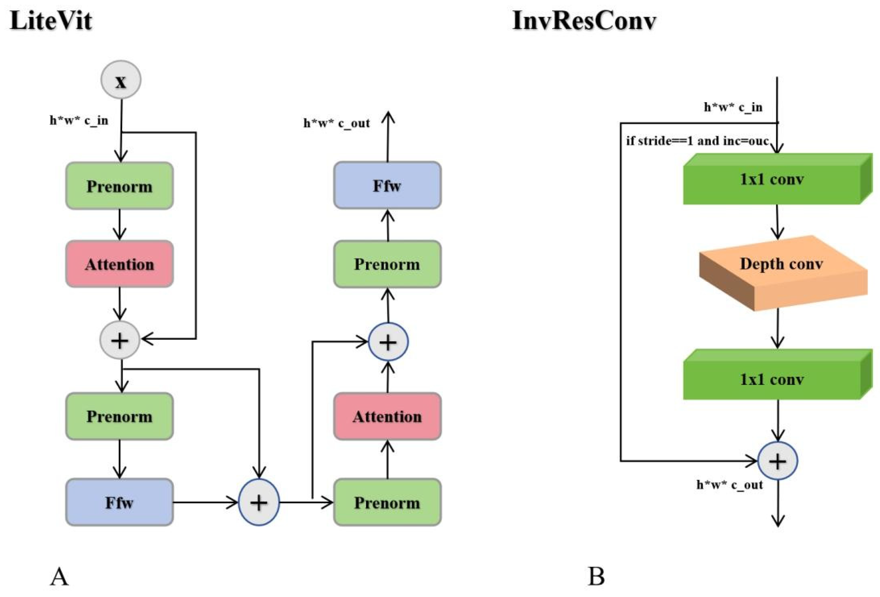 LiteVit follows the efficient Transformer blocks used in MobileViTv3, incorporating multi-head self-attention and feed-forward layers with normalization to balance representational capacity and computational cost. MixVit further extends this design by integrating convolutional layers, such as InvResConv, with LiteVit, enabling more effective fusion of local and global features.