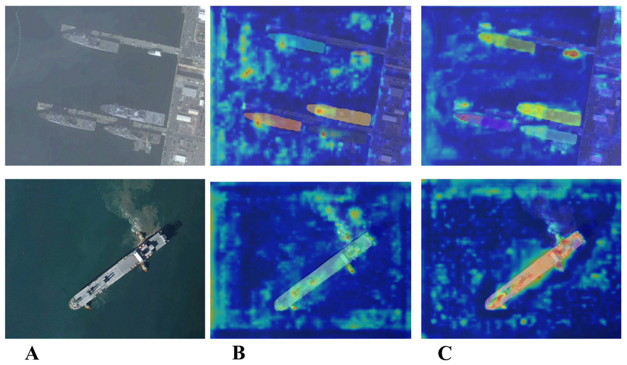 Figure 4, CVTA not only suppresses background clutter but also more effectively captures ship regions and boundaries. These heatmaps are generated using the Grad-CAM [