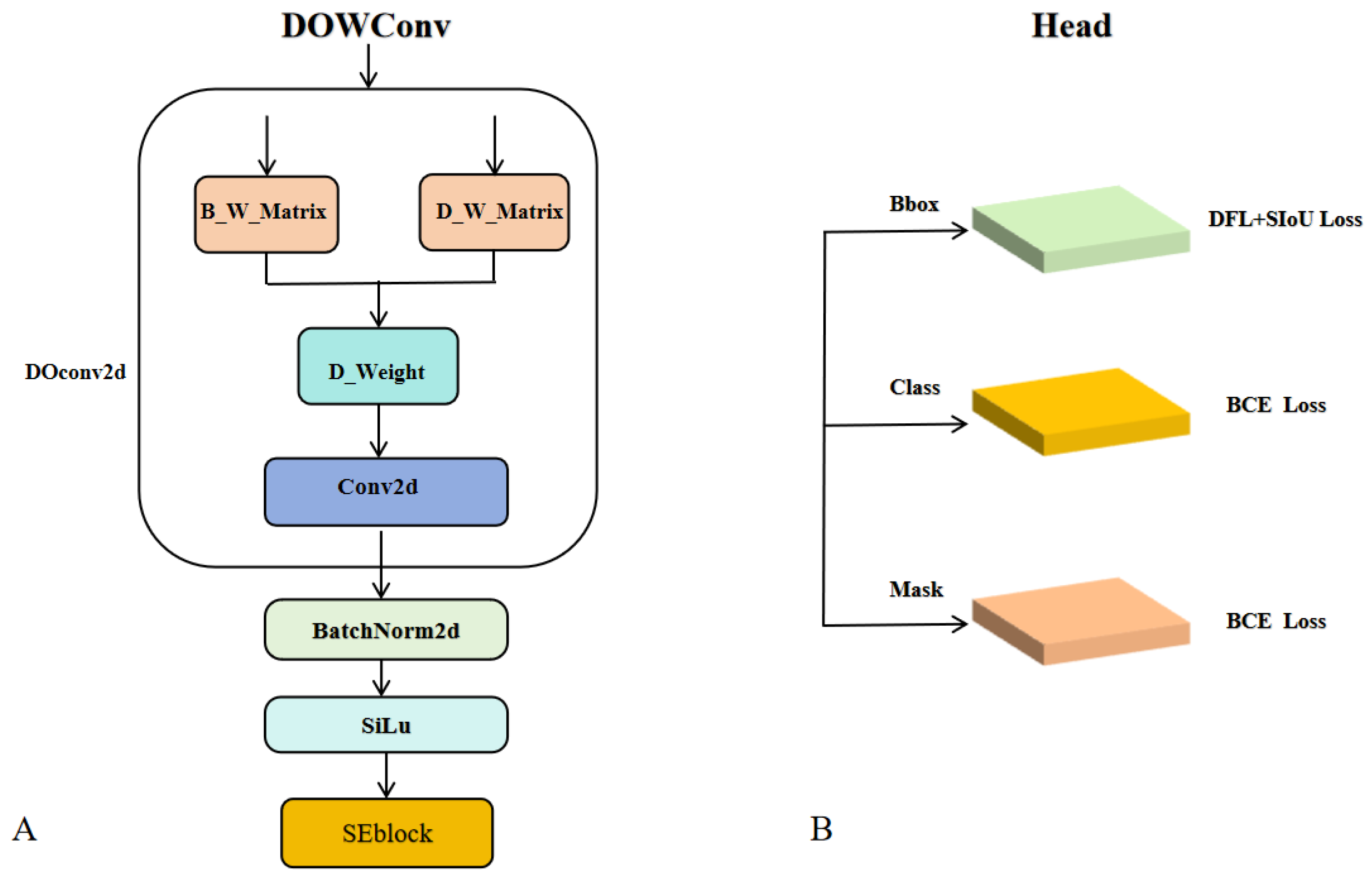 Figure 5A, the DOWConv module consists of a DOConv2d layer, batch normalization, an activation function, and a squeeze-and-excitation (SE) block. The DOConv2d layer includes two learnable weight matrices: (1) a base weight matrix (B_W_Matrix), initialized using Kaiming initialization to provide the kernel’s foundational parameters; and (2) a dynamic weight matrix (D_W_Matrix), which incorporates a diagonal matrix D
