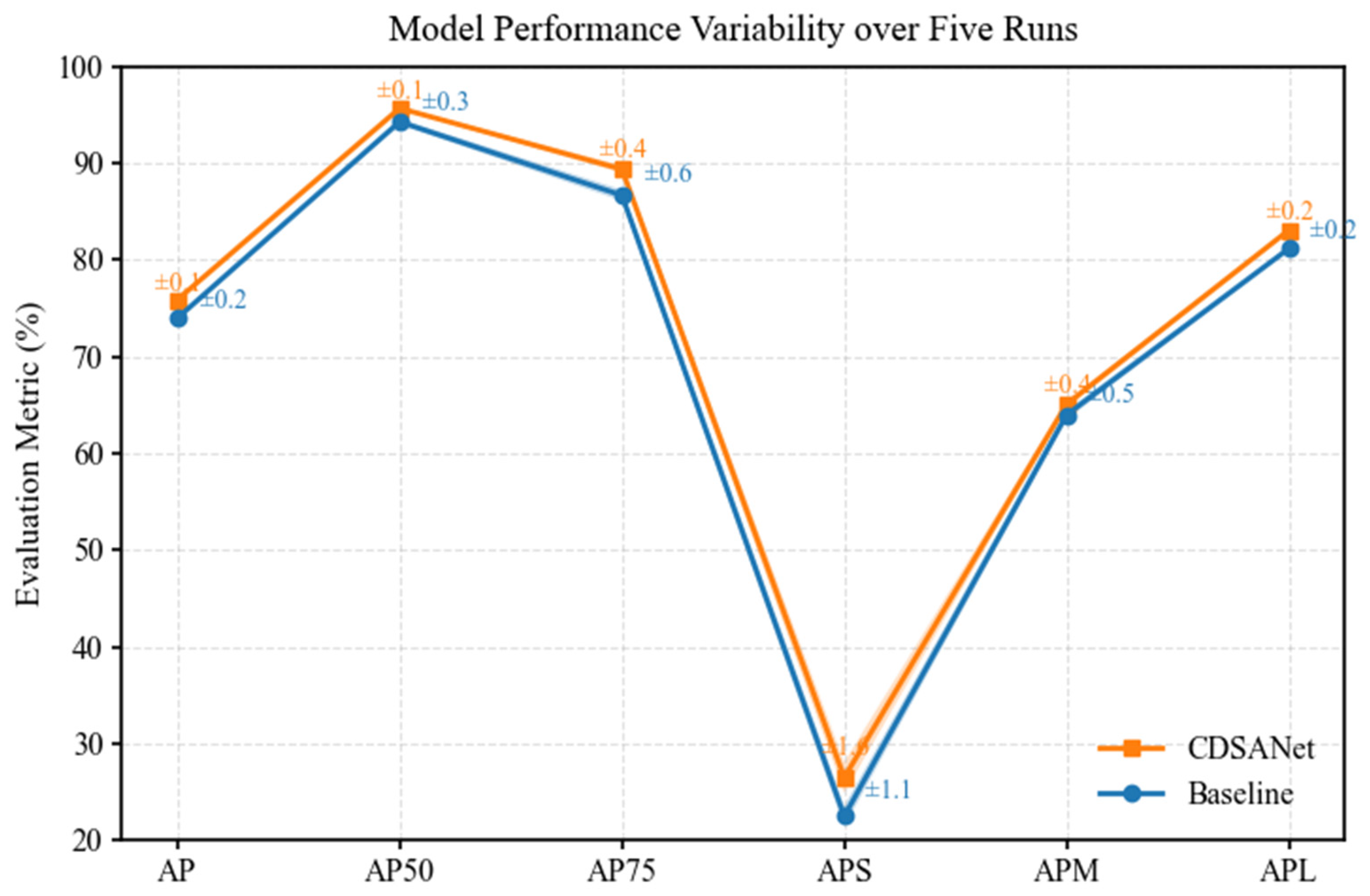 Table 9, CDSANet achieves a favorable balance in model size, parameter count, FLOPs, and inference speed compared with state-of-the-art segmentation models. Nevertheless, it still lags behind the lightweight YOLOv8 baseline. Additionally, CDSANet is currently implemented on an early version of YOLOv8 and may not fully exploit the architectural and optimization improvements introduced in later versions such as YOLOv11. Although YOLOv11 offers certain advantages, it still primarily relies on conventional CNN backbones and CIoU-based loss functions, which limit global feature modeling and boundary localization. On our dataset, YOLOv11, three versions ahead of YOLOv8, achieves only modest performance improvements.
