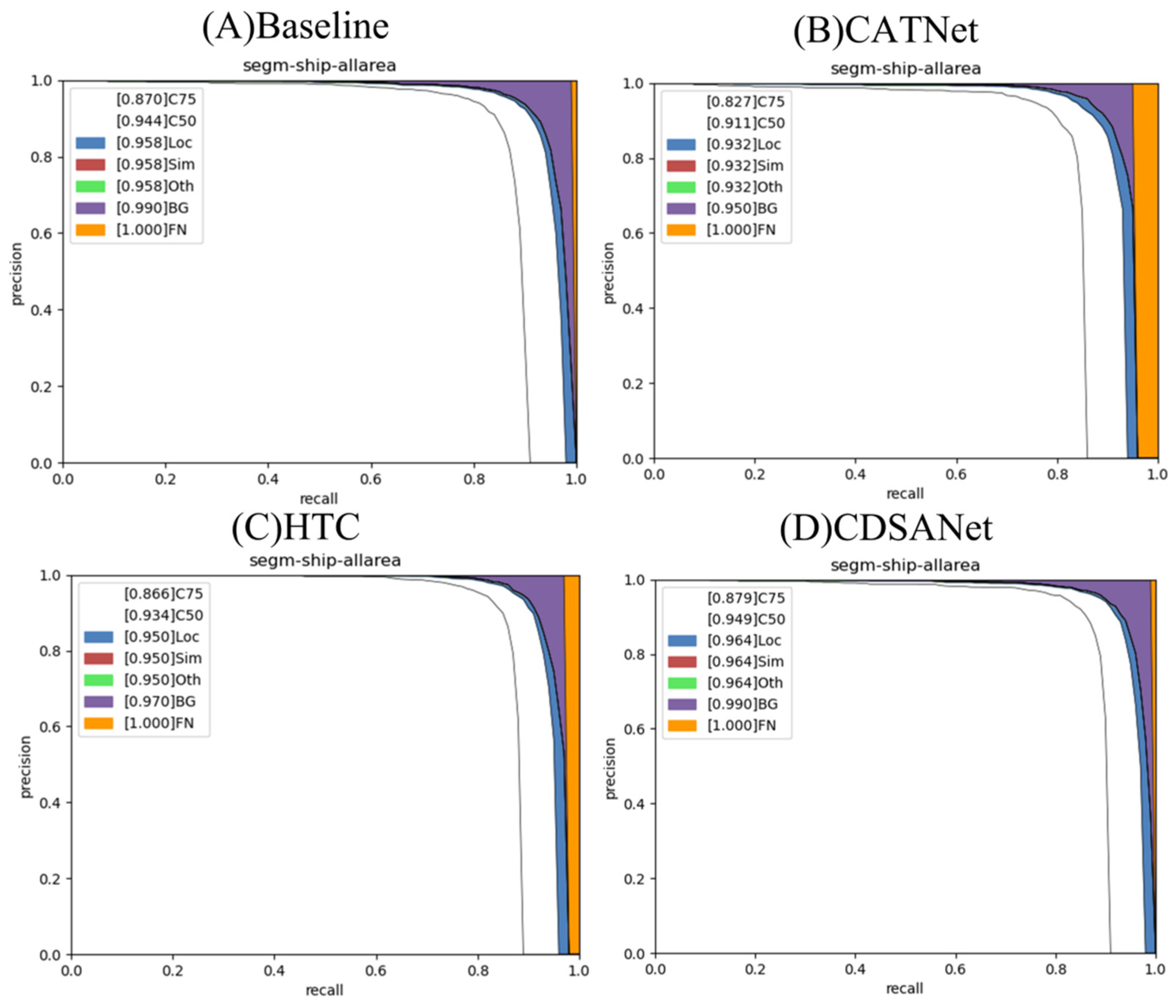 Due to the scarcity of ship datasets in complex maritime environments, further validation is needed to assess CDSANet’s performance in such challenging scenarios. Compared with widely adopted frameworks such as Mask R-CNN and Cascade Mask R-CNN, CDSANet converges more slowly and requires additional training epochs to reach optimal accuracy. As shown in