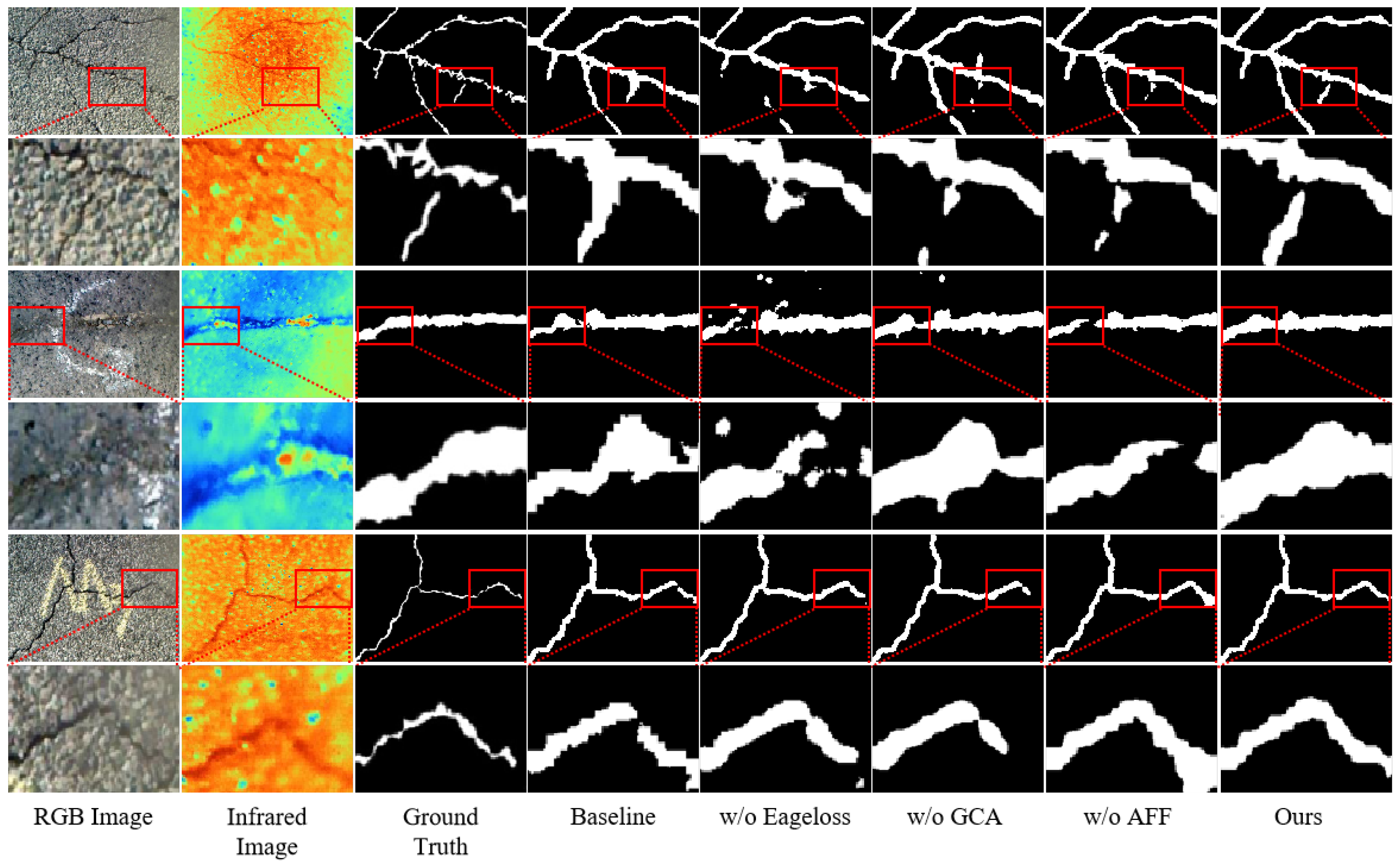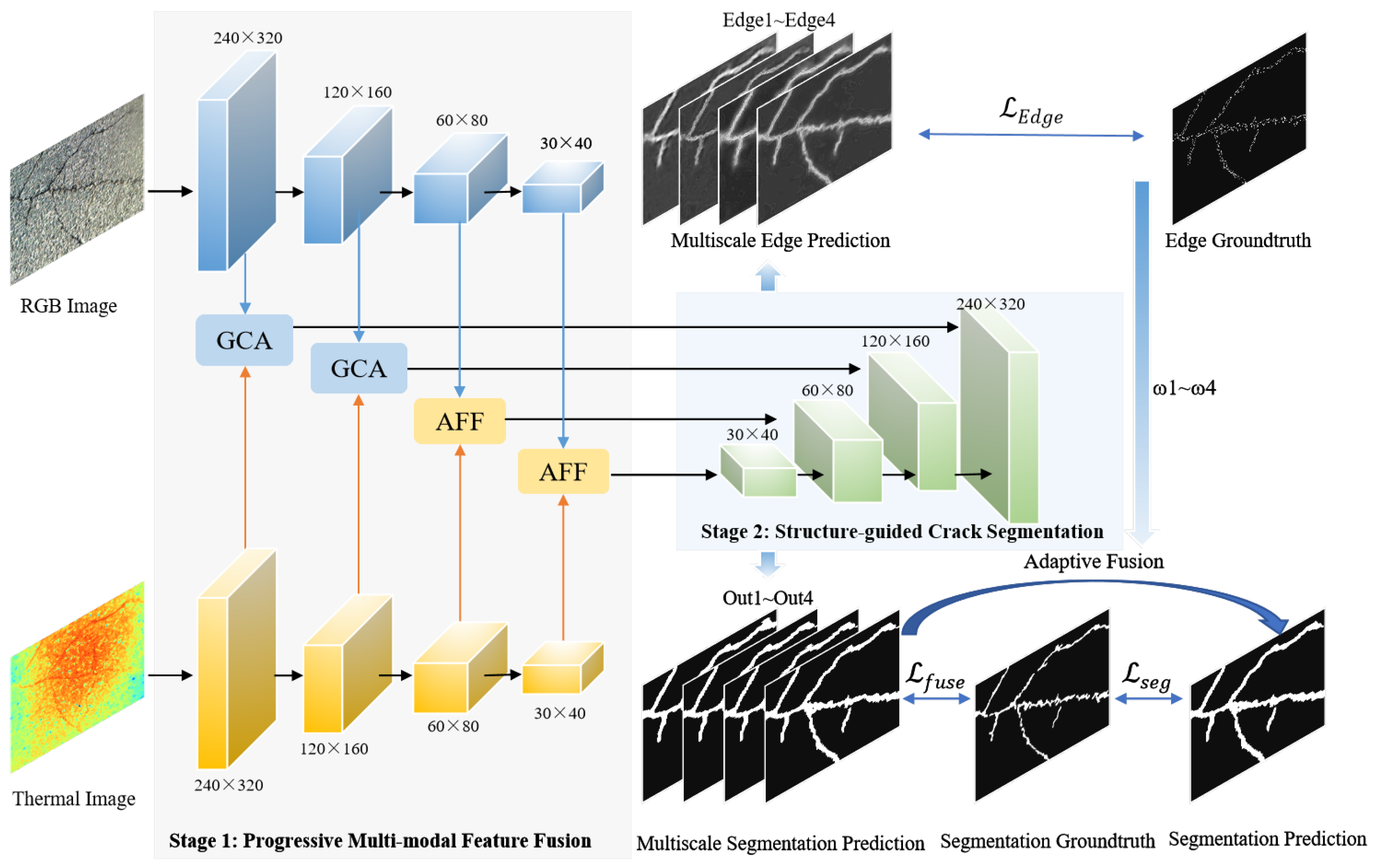 - An end-to-end edge-guided progressive multi-modal segmentation network is proposed in this work. The developed framework is designed to jointly leverage both RGB and thermal infrared information while incorporating structural priors. By embedding edge-aware supervision throughout the decoding process, the overall accuracy and robustness of crack segmentation are significantly enhanced, effectively addressing the boundary blurring issue commonly encountered in conventional approaches.
