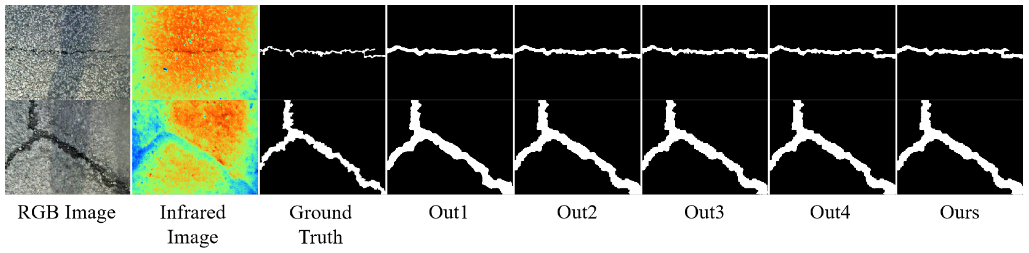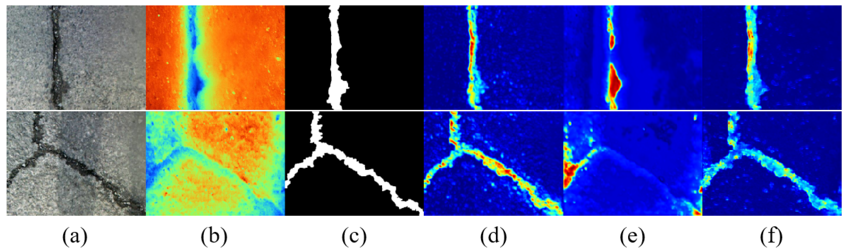 - Xiao, R.; Chen, X. IRFusionFormer: Enhancing Pavement Crack Segmentation with RGB-T Fusion and Topological-Based Loss. arXiv 2024, arXiv:2409.20474. [Google Scholar]
