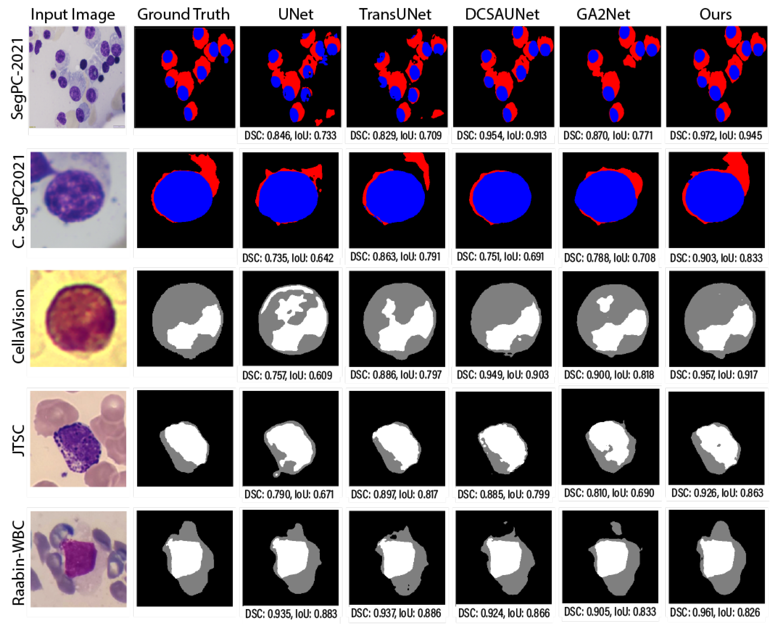| Model | SegPC-2021 | Cropped SegPC-2021 | CellaVision | JTSC | Raabin-WBC | |||||