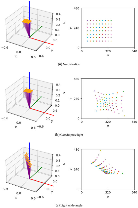 Traditional calibration relies on the pinhole camera model combined with parametric distortion models such as the Brown–Conrady radial–tangential model [1,2,15]. While effective in many cases, these models often fail to capture complex distortions from fisheye or low-cost wide-angle lenses. More flexible models, including high-order polynomials [3], omnidirectional models [16], and inverse distortion approaches [4], offer improved accuracy but at the cost of increased complexity and sensitivity to data quality.