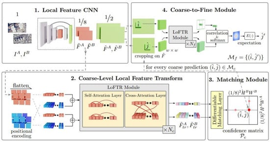 - Sun, J.; Shen, Z.; Wang, Y.; Bao, H.; Zhou, X. LoFTR: Detector-Free Local Feature Matching with Transformers. In Proceedings of the IEEE/CVF Conference on Computer Vision and Pattern Recognition (CVPR), Nashville, TN, USA, 20–25 June 2021. [Google Scholar]