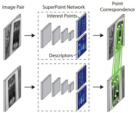 The SuperPoint architecture is a fully convolutional neural network that detects interest points and generates local feature descriptors corresponding to these points from an input image. While traditional methods perform these two operations in separate stages, SuperPoint unifies them within a single framework, allowing for real-time and consistent feature extraction. As illustrated in (Figure 3), the detected keypoints are repeatable across different imaging conditions and correspond to distinctive regions in the scene, while the learned descriptors encode their local structural information. Thus, reliable geometric correspondences can be established between image pairs.