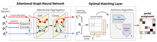 - Sarlin, P.E.; DeTone, D.; Malisiewicz, T.; Rabinovich, A. Superglue: Learning feature matching with graph neural networks. In Proceedings of the IEEE/CVF Conference on Computer Vision and Pattern Recognition, Seattle, WA, USA, 13–19 June 2020; pp. 4938–4947. [Google Scholar]