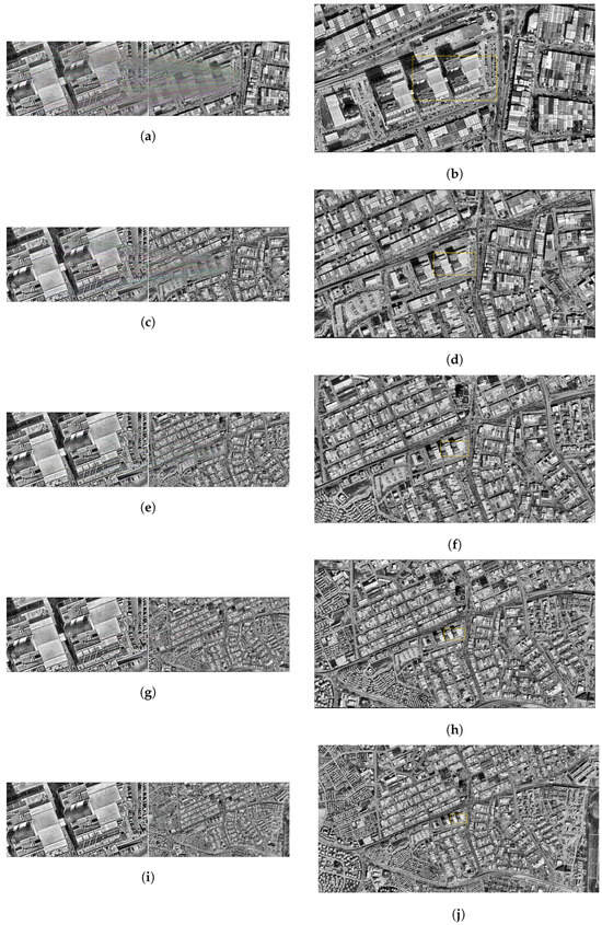 The accuracy rate obtained as a result of the matching at 2500 m decreased to 41%. It is noteworthy that the matching lines in the images are both small in number and show a random distribution in some regions. The difference between the predicted position and the actual position is about 8.10 m, indicating that the system is beginning to lose its reliability at this level of resolution (Figure 6i,j).