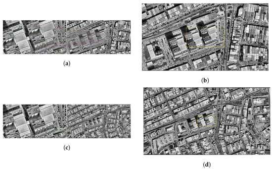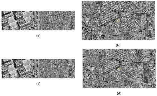 The matching results obtained at an altitude of 1000 m are also generally successful. The matching lines in the image are mapped to their counterparts on the satellite in a way that is consistent with the structural features in the drone image. The region determined on the satellite is similar to the actual location of the drone image. Looking at the numerical values, the distance between the detected area after the match and the actual drone location was calculated as 1.13 m. This value is still within an acceptable accuracy range for an altitude of 1000 m and shows that the algorithm can work effectively at medium resolution (Figure 8c,d).