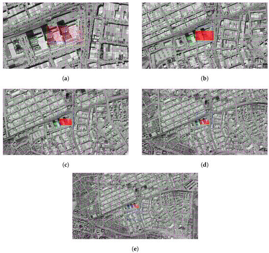Matching regions on the satellite image obtained from an altitude of (a) 3000 m, (b) 3500 m, (c) 4000 m, (d) 4500 m, (e) 5000 m (with Superpoint and SuperGlue algorithm).